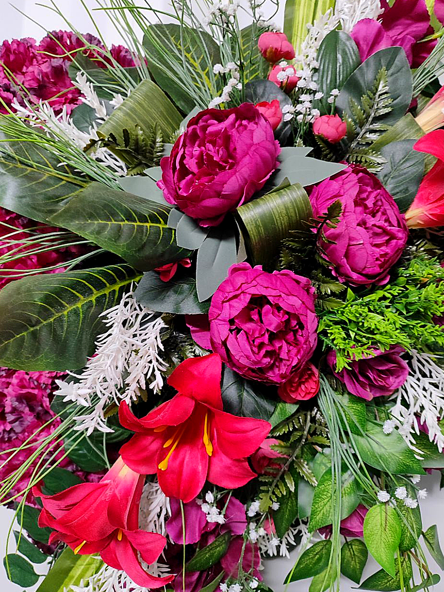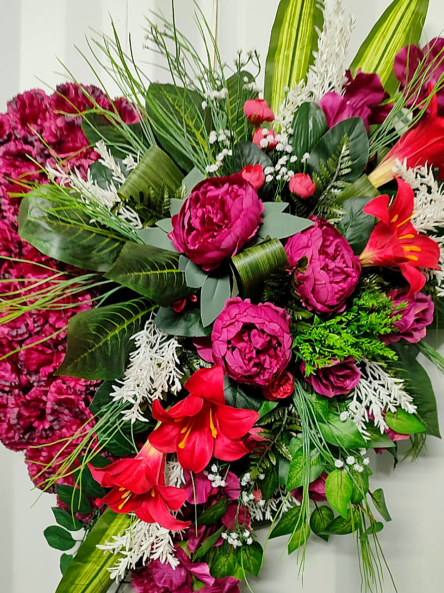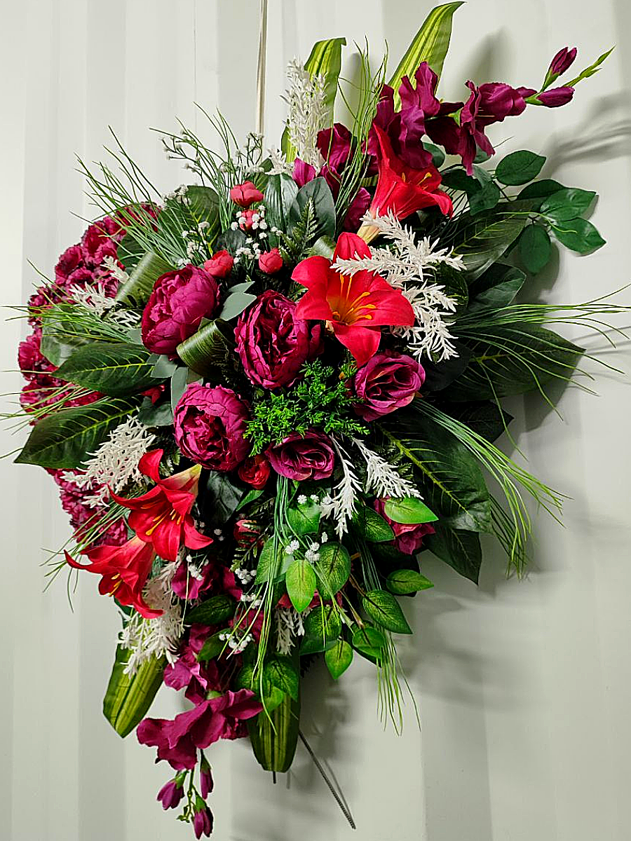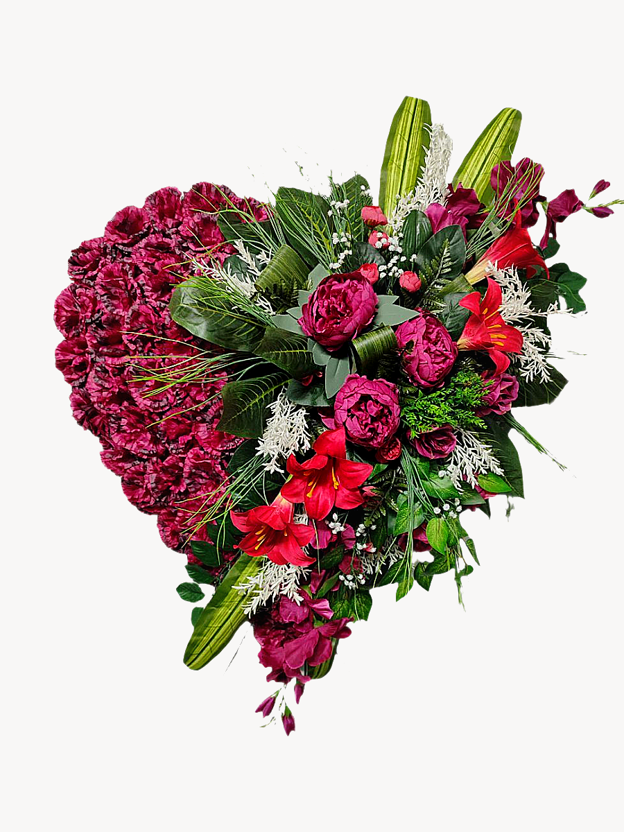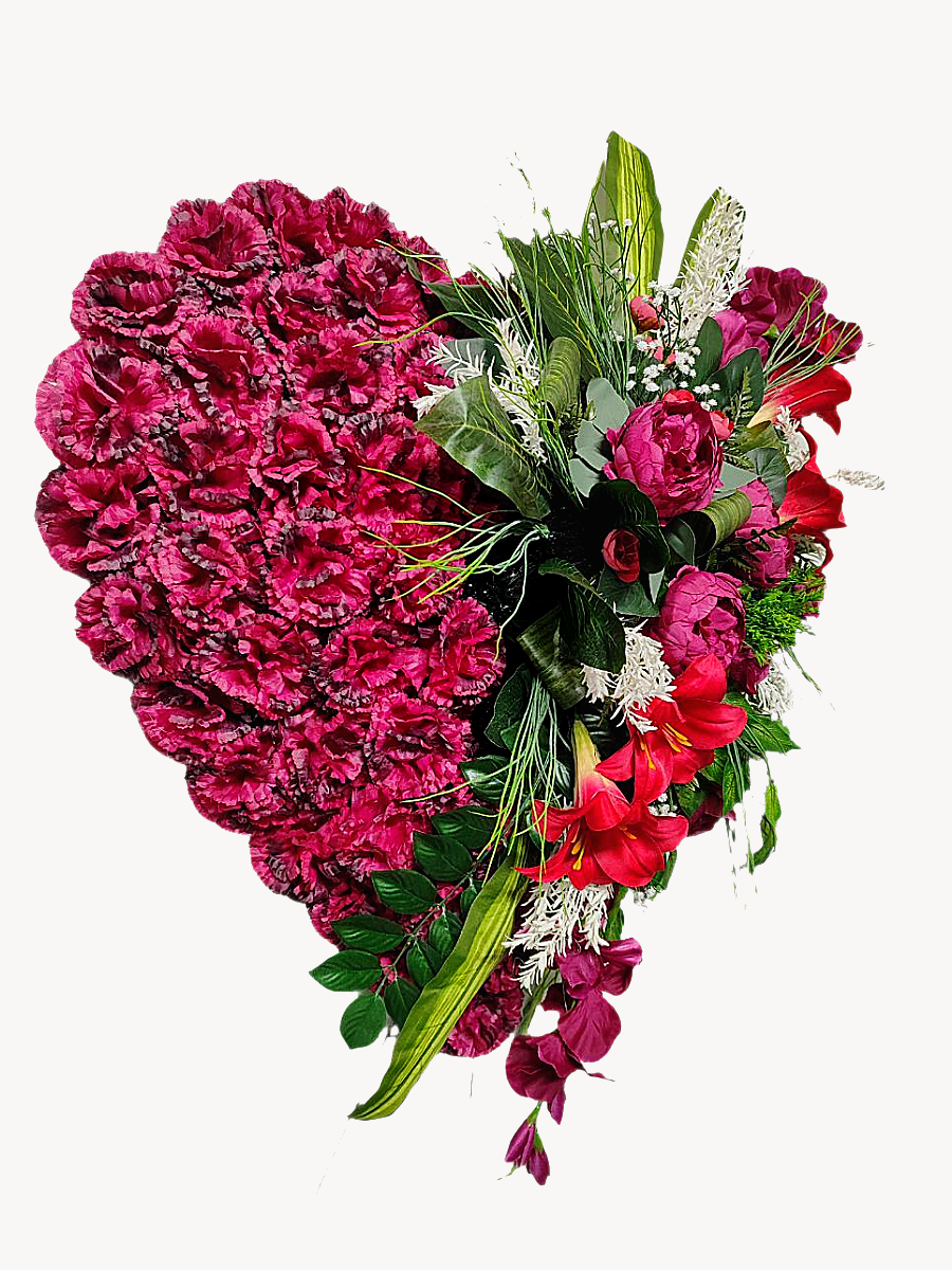 Венок Сердце ритуальный на кладбище – представляет собой композицию из искусственных цветов и искусственной зелени на металлическом каркасе с ножками для установки в землю. Композиция выполнена из высококачественных материалов, благодаря чему сохраняет свой первоначальный вид на протяжении долгого времени. Венок на похороны станет достойным выбором на день памяти и альтернативой цветам на кладбище, в день похороны, поминки, родительской субботы или Радоницы.